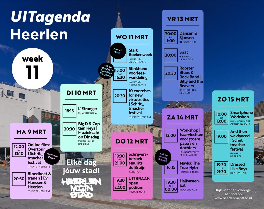Woensdag trapt de Boekenweek af bij SCHUNCK, kun je meewandelen met de Stinkhond Voorleeswandeling en beleef je “10 exercises for new virtuosities” tijdens het Schrit_tmacher Festival. Donderdag bezoekt schrijver Maurits de Bruijn of ontdek je nieuw talent bij UITBRAAK open podium. Het weekend biedt volop activiteiten, zoals dansen, blues en meer.