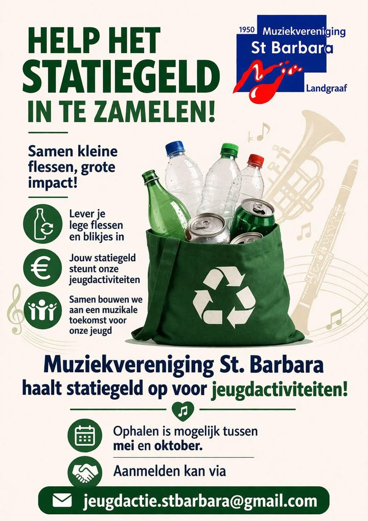 LANDGRAAF â Ook dit jaar zal de jeugdcommissie van Muziekvereniging St. Barbara G.A./Landgraaf geld inzamelen voor jeugdactiviteiten. Vanaf mei tot en met oktober kunnen mensen statiegeld flessen en blikjes of kassabonnetjes inleveren.